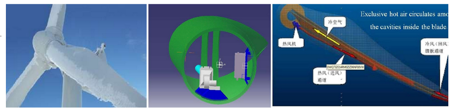 氣流方向如紅色、黃色箭頭所指。加熱時(shí)葉片腔內(nèi)氣流通過加熱后沿紅色箭頭所指方向通過玻璃鋼通風(fēng)管吹向葉尖位置,氣流從葉尖通過與腹板形成的風(fēng)道形成完整的空氣循環(huán)流動(dòng)路線,腔內(nèi)空氣的循環(huán)加熱可以有效加熱葉片結(jié)冰區(qū)域(從12米到45米)并兼顧葉片后緣和葉根段,達(dá)到葉片防、除冰效果。